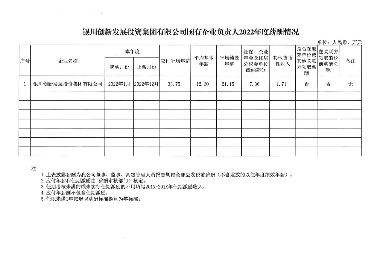 根據(jù)《銀川市屬國有企業(yè)負(fù)責(zé)人薪酬管理辦法(試行)》(銀國資發(fā)〔2021〕458號(hào))、《銀川市屬國有企業(yè)負(fù)責(zé)人經(jīng)營業(yè)績考核辦法(試行)》(銀國資發(fā)〔2021〕459號(hào))、《銀川市屬國有企業(yè)負(fù)責(zé)人經(jīng)營業(yè)績考核實(shí)施細(xì)則(試行)》規(guī)定,經(jīng)銀川市國資委核定,現(xiàn)將銀川創(chuàng)新發(fā)展投資集團(tuán)有限公司企業(yè)負(fù)責(zé)人2022年度薪酬信息予以披露。